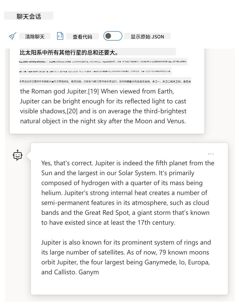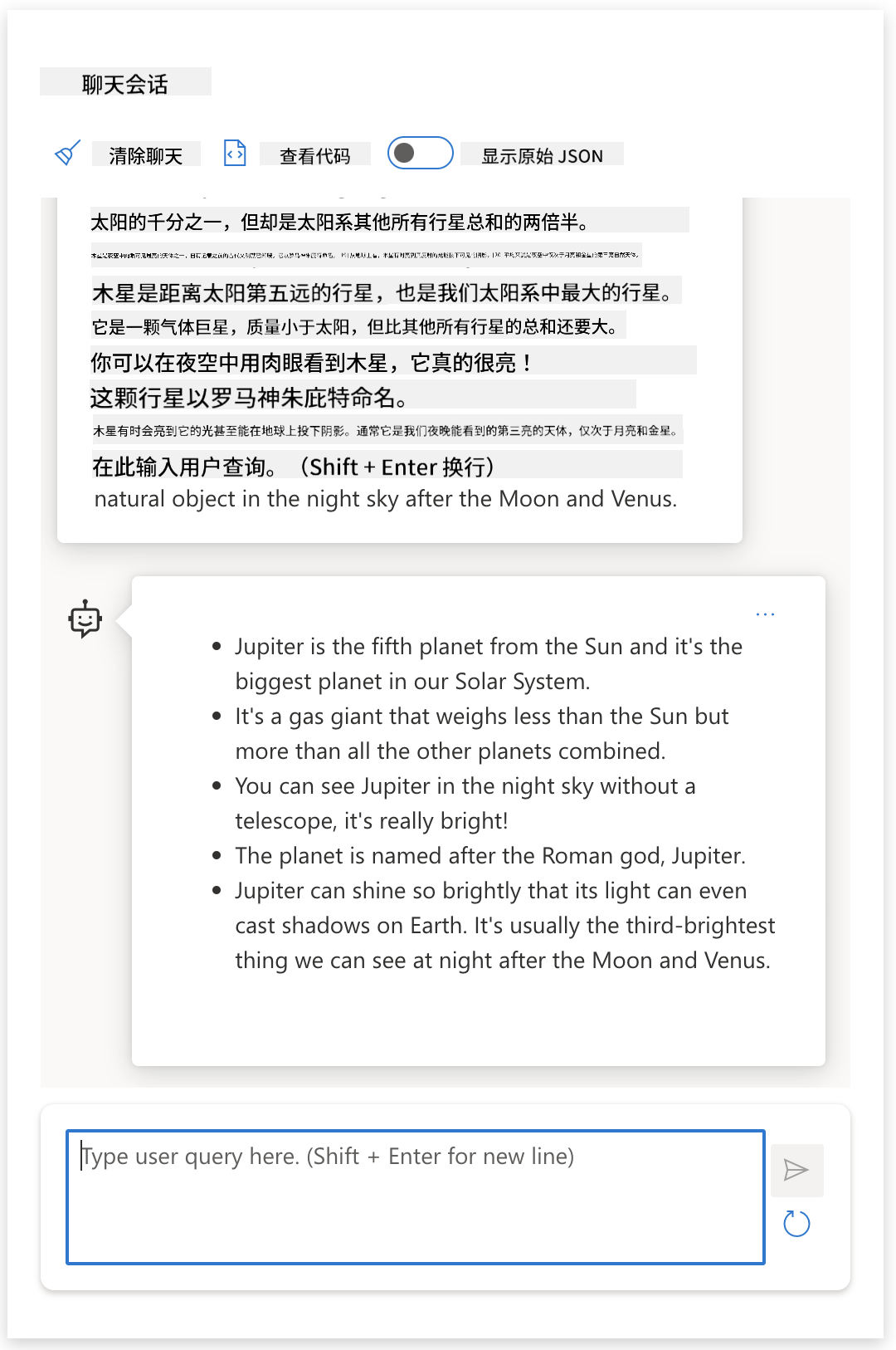 在Azure OpenAI Playground输入简单提示如“木星是…”,观察基础模型的补全结果: