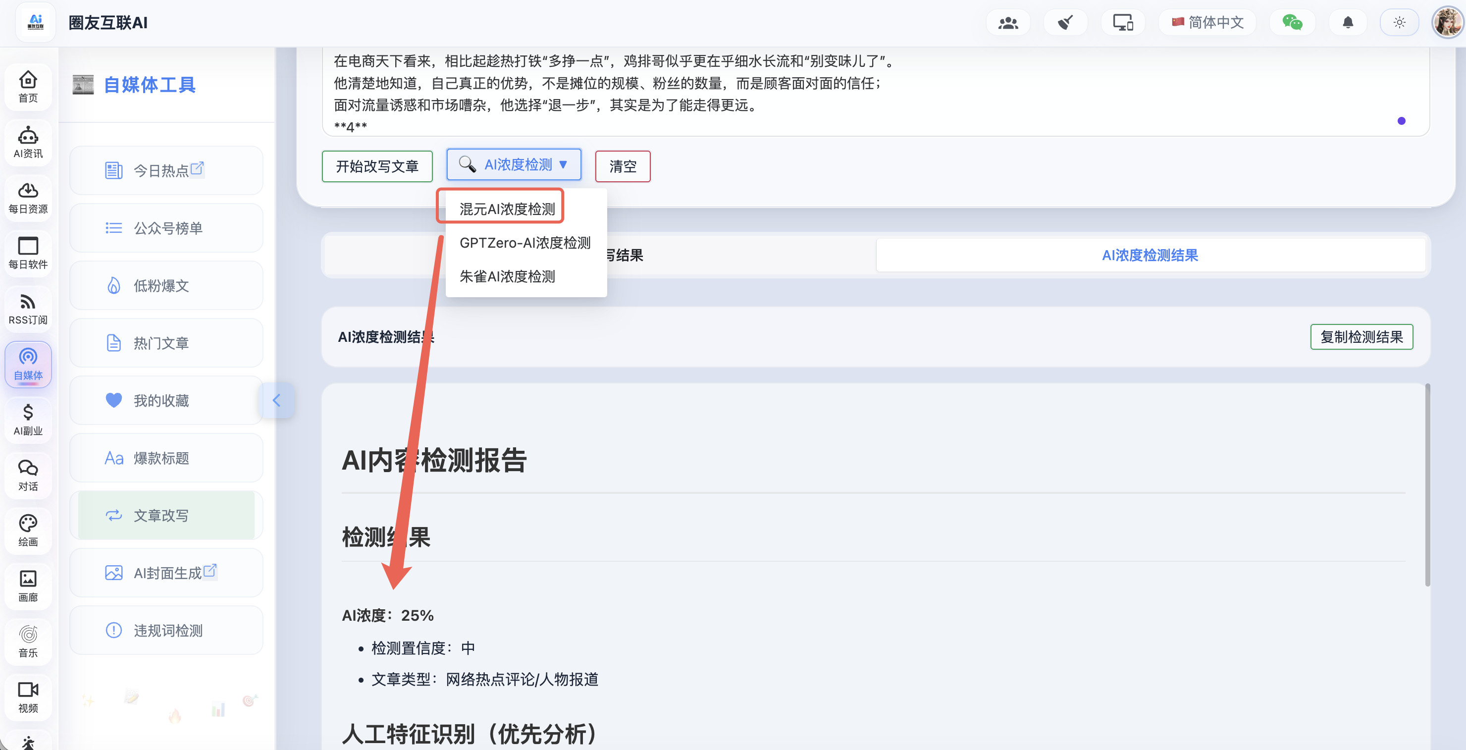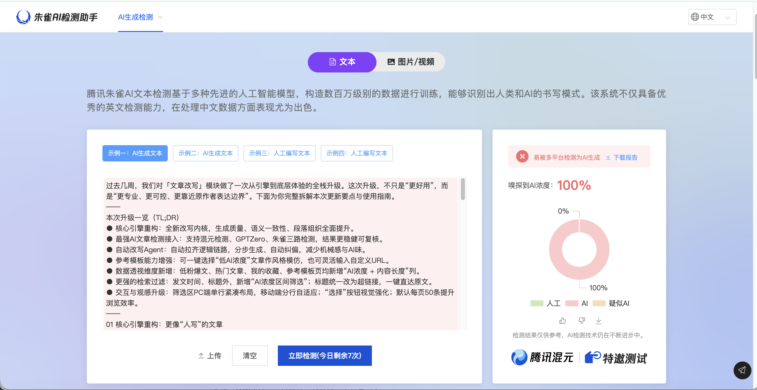 - 最强AI文章检测接入:支持混元检测、GPTZero、朱雀三路检测,结果更稳健可复核。