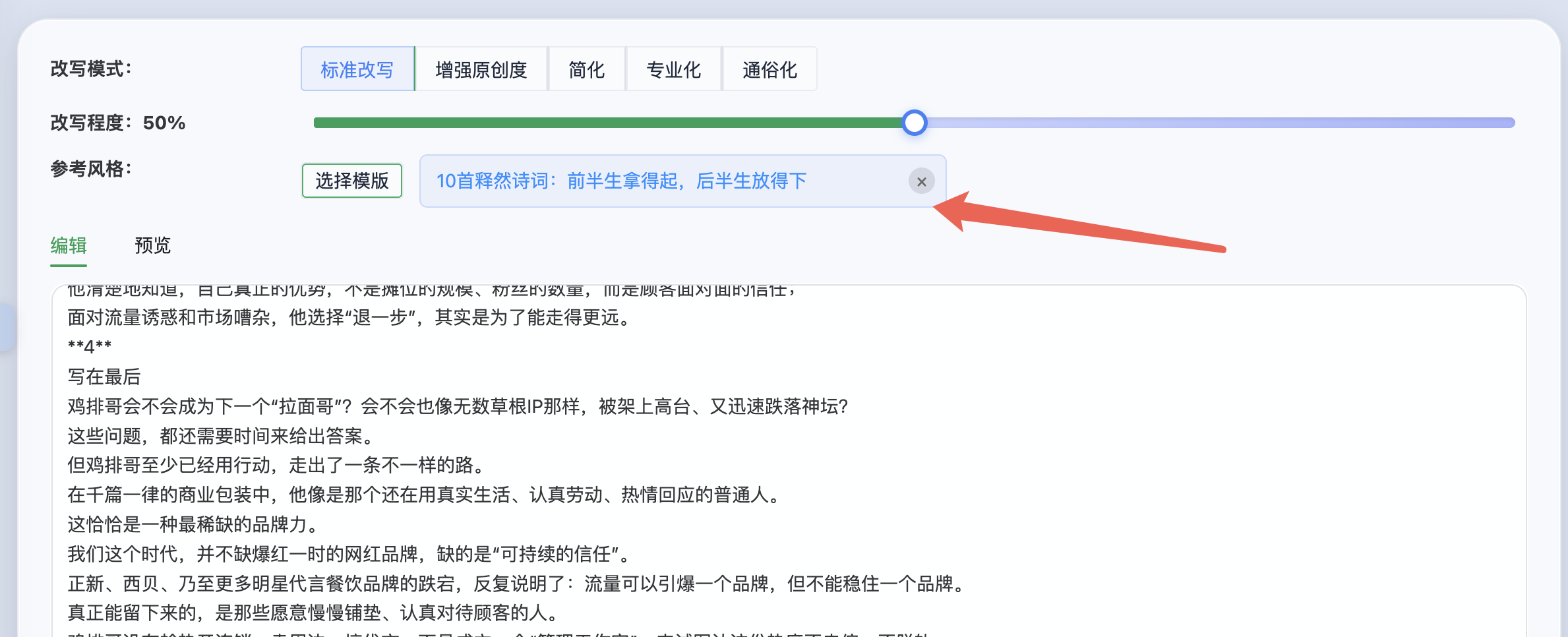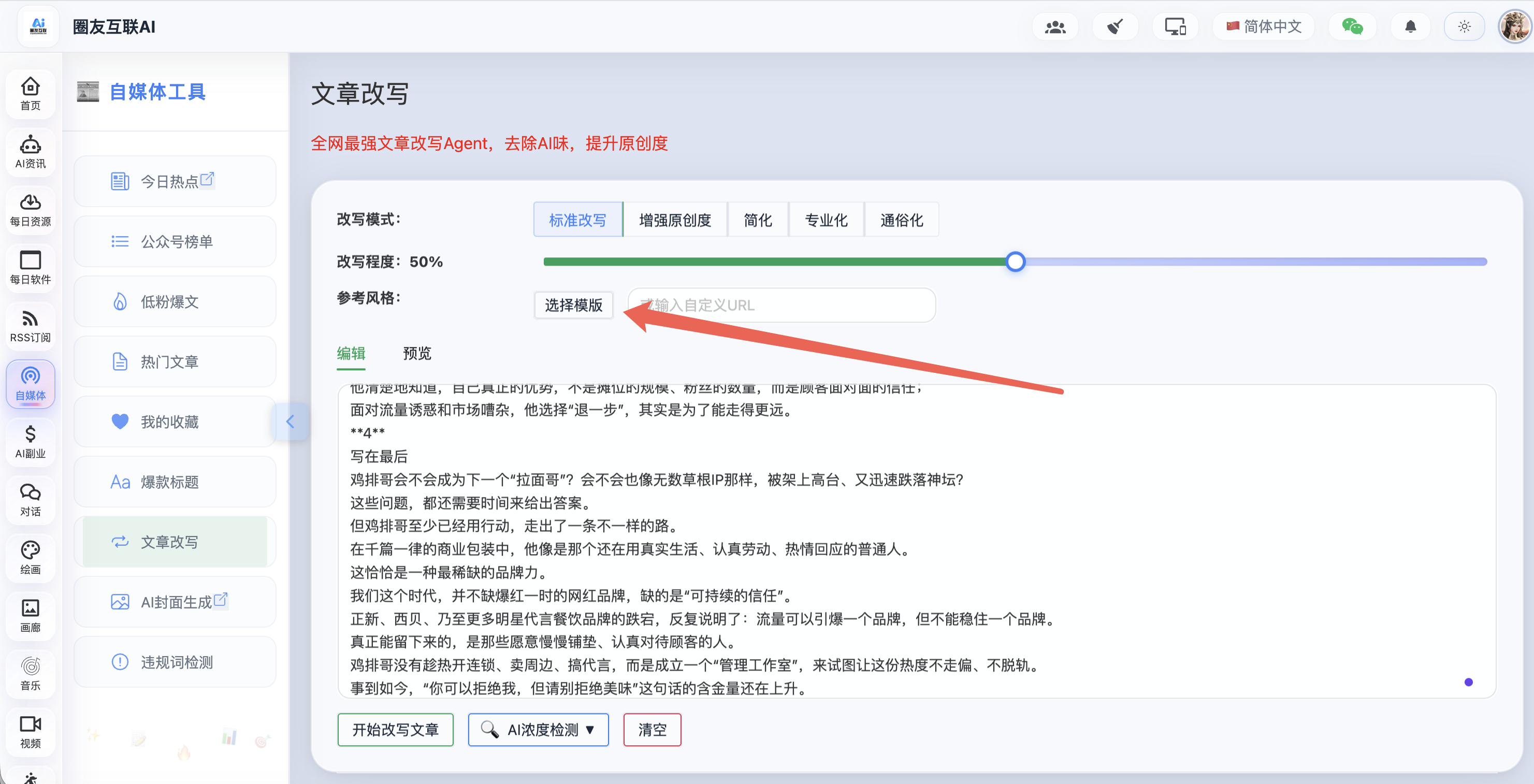 - 参考模板能力增强:可一键选择“低AI浓度”文章作风格模仿,也可灵活输入自定义URL。