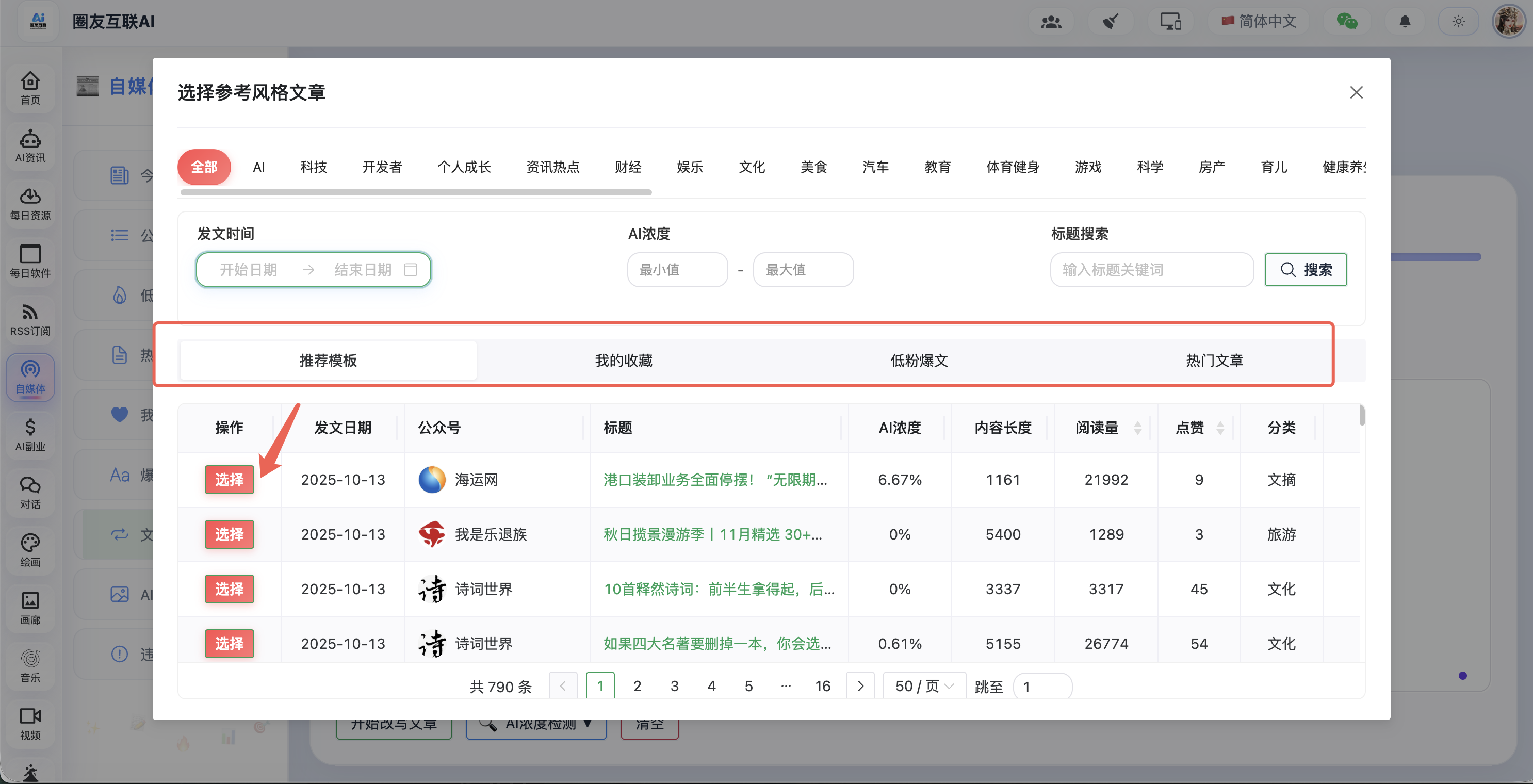 4、参考模板升级:可选“低AI浓度文章”做风格模仿