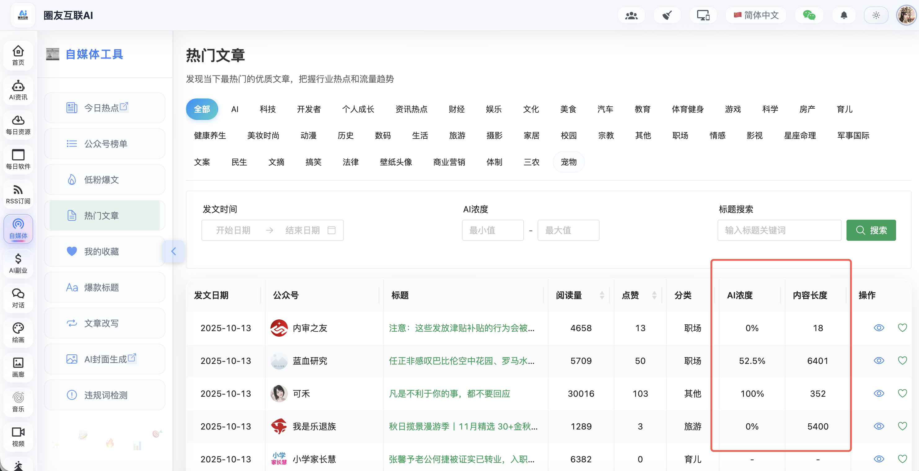 - 更强的检索过滤:发文时间、标题外,新增“AI浓度区间筛选”;标题统一改为超链接,一键直达原文。