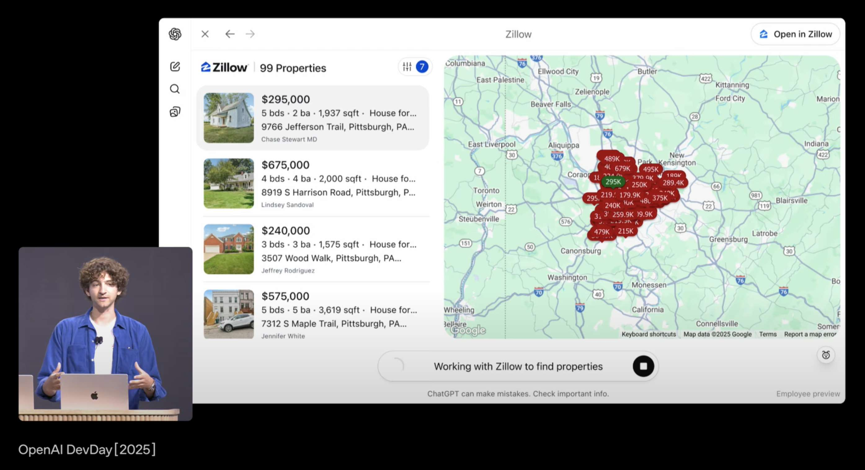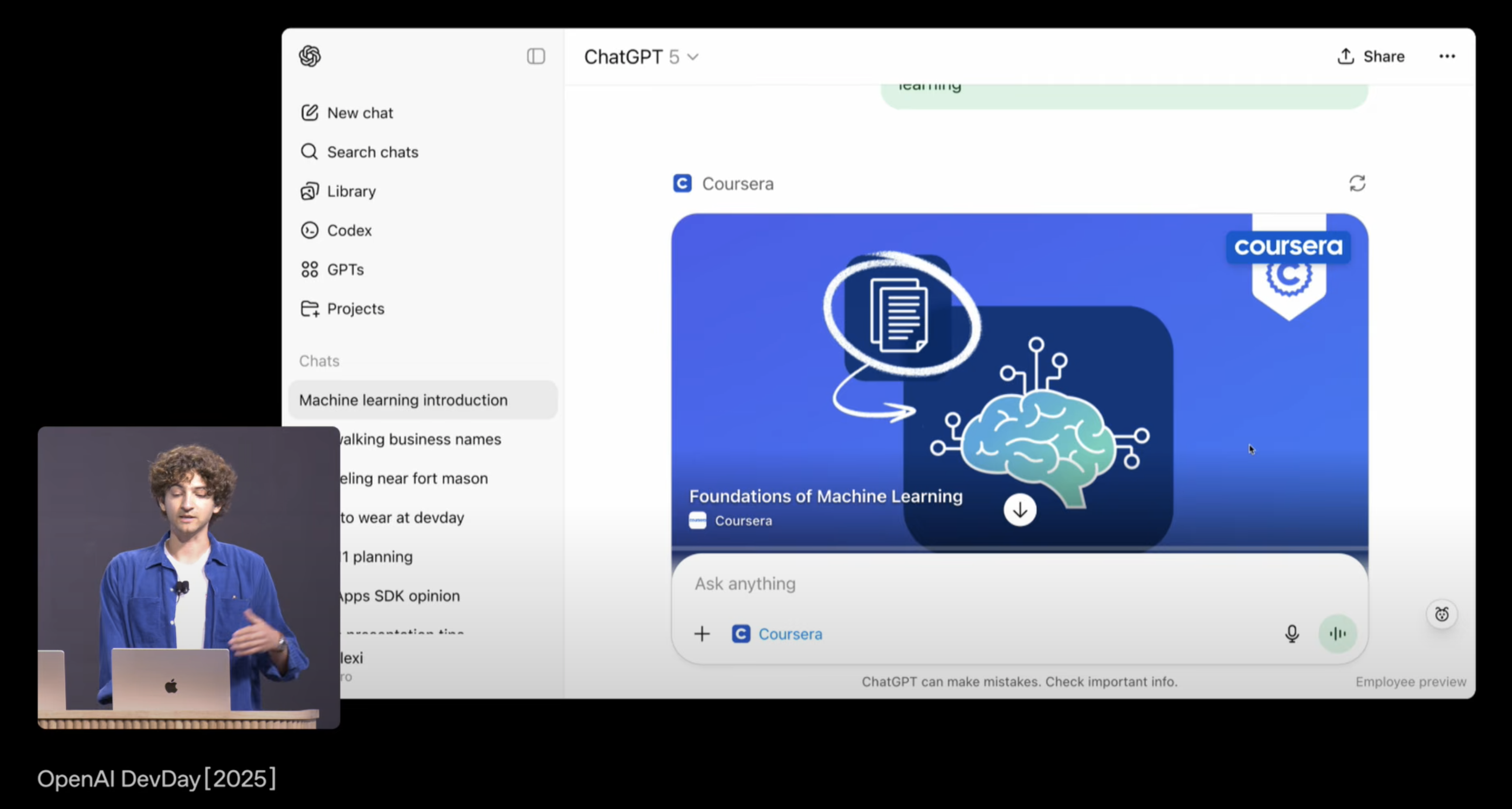 Apps SDK这个东西,说白了就是让开发者把应用直接塞进ChatGPT里。现场演示的时候,在聊天框里可以直接播放Coursera的课程视频