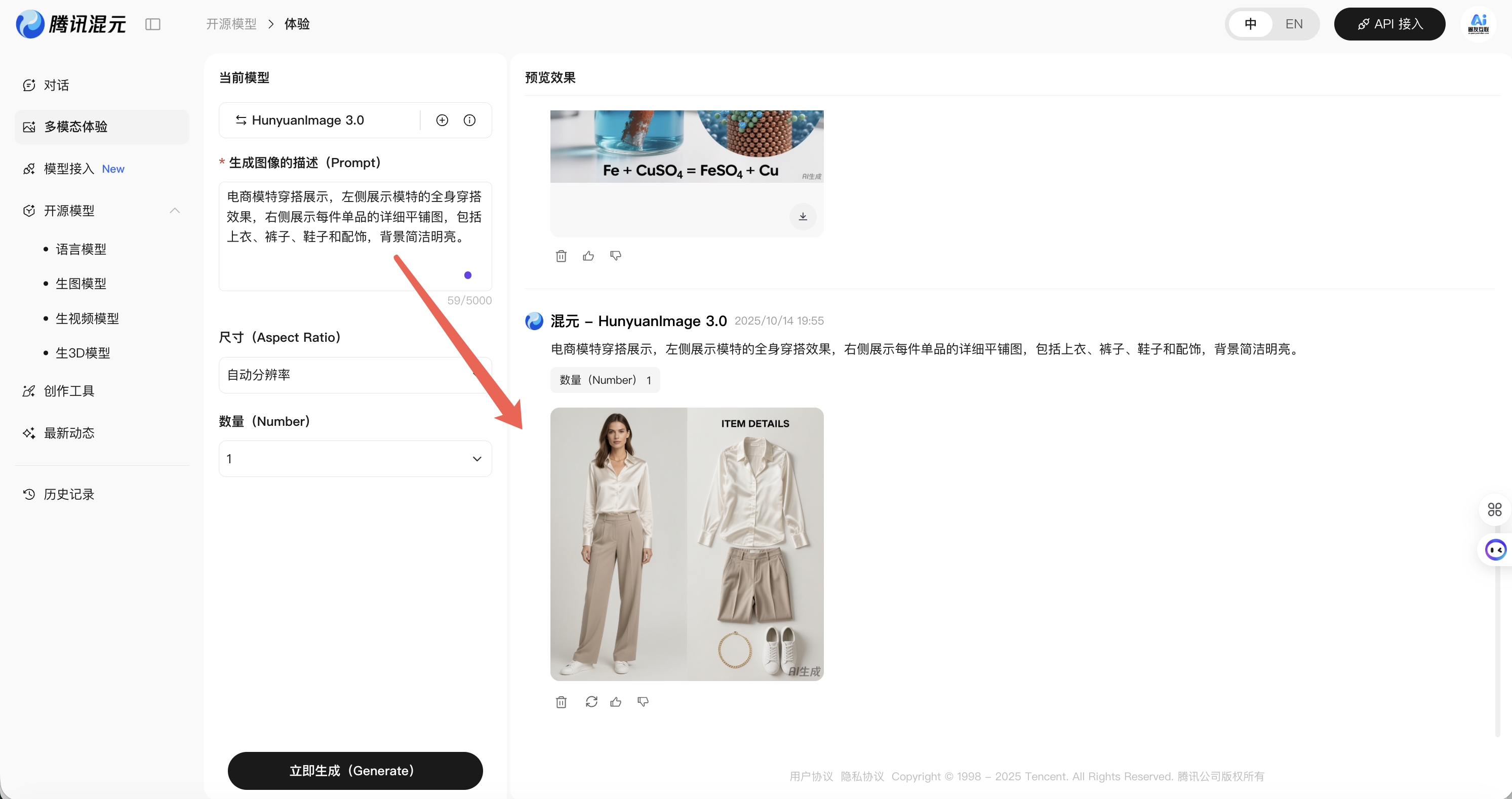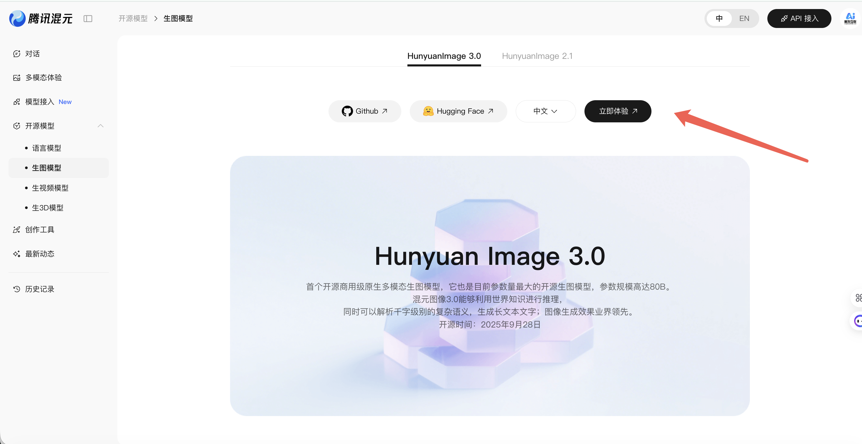 首先进到腾讯生图模型官网:https://hunyuan.tencent.com/image/zh?tabIndex=0,找到 HuyuanImage3.0,点击立即体验