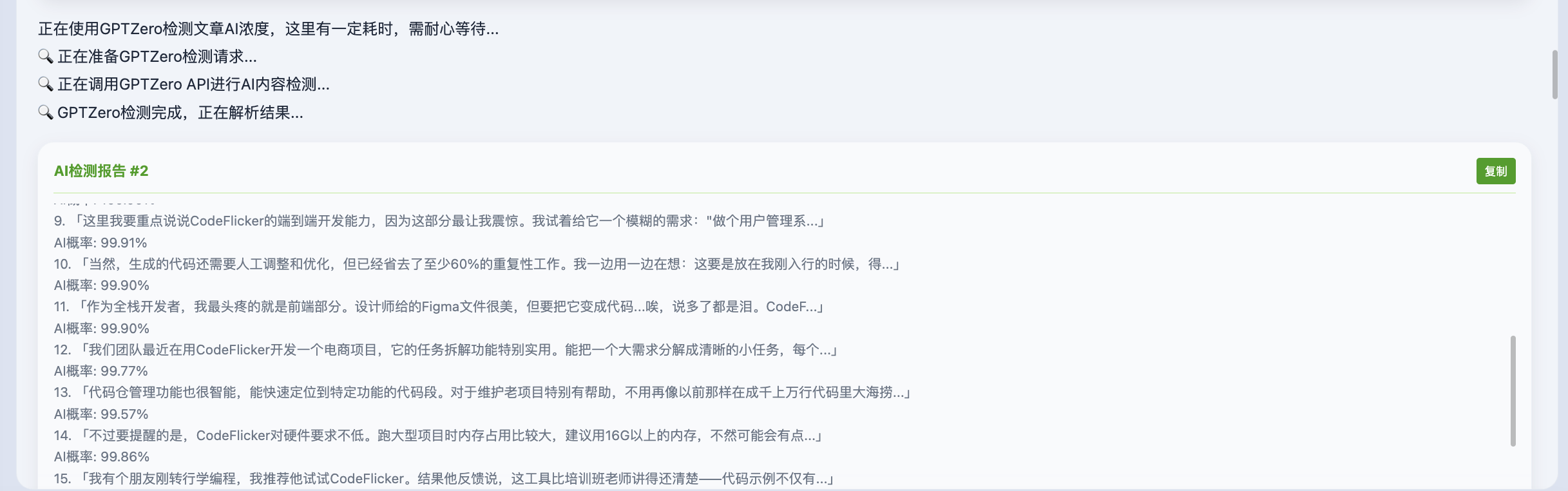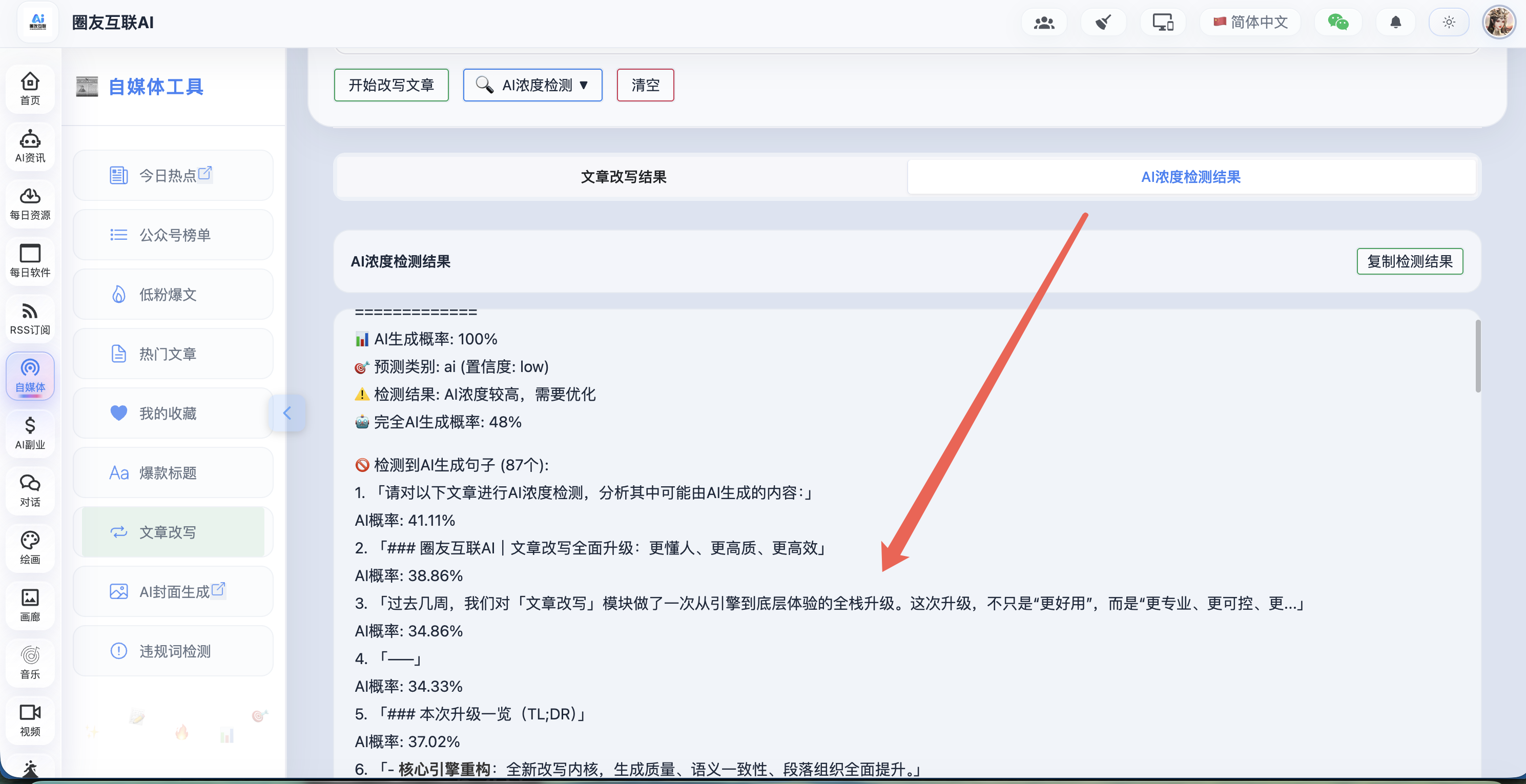 - 写完后会自动进行 AI 浓度检测,如果 AI 浓度超过了 40%,会根据每一行的 AI 浓度逐行进行修改!