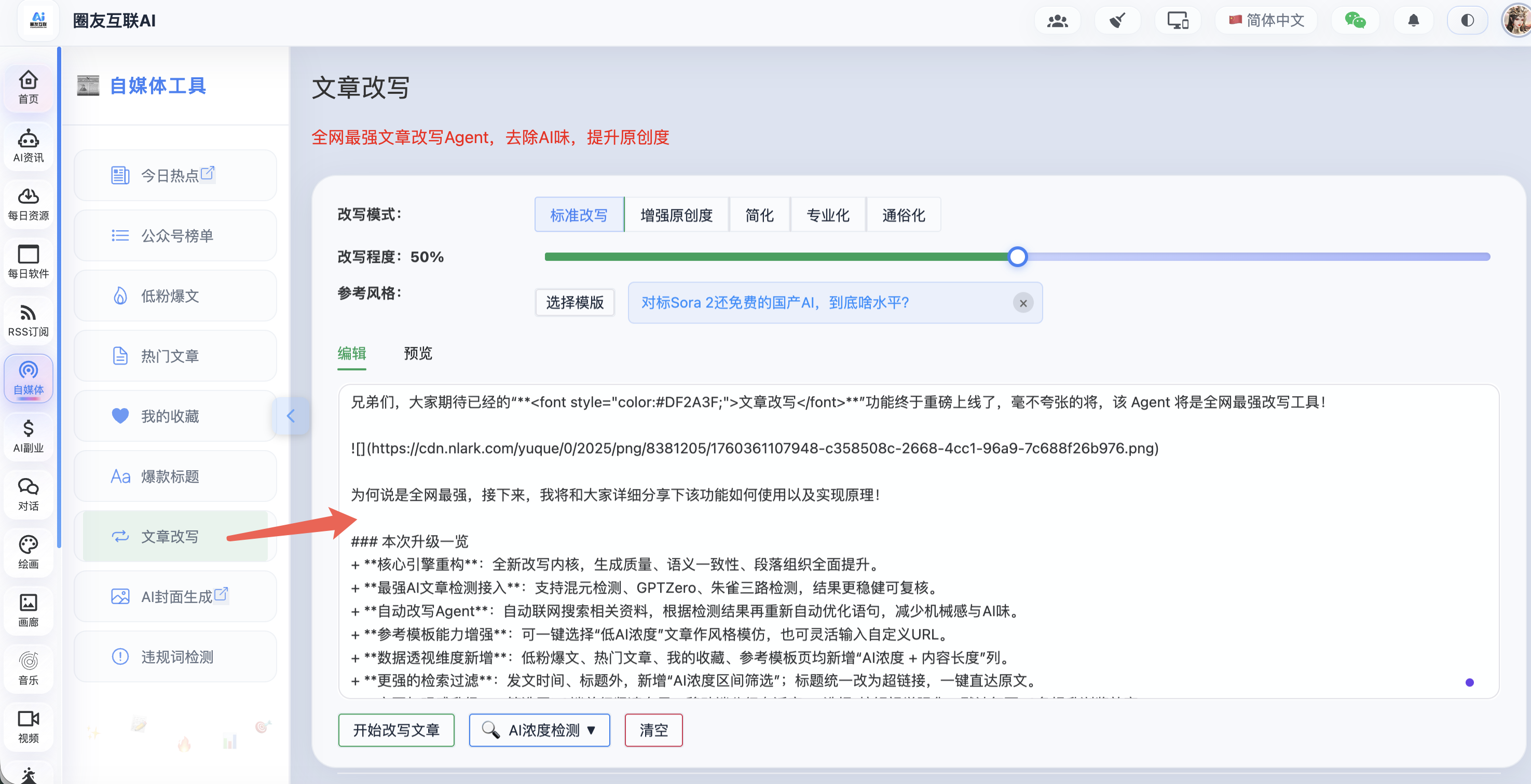 这款文章改写Agent太强了,不仅支持低粉爆文,还能完美去除AI浓度检测!
